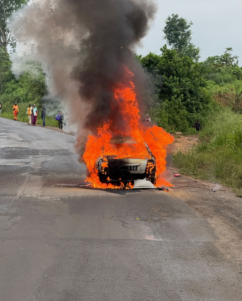 Viaje muy largo esta vez por el cambio de rutas de Air France debido a problemas políticos con los países del Sahel. Una vez en Douala y después de un sueño reparador iniciamos el viaje en la nueva Toyota por carretera donde no paran de suceder acontecimientos como este coche incendiado No sabemos si era eléctrico..