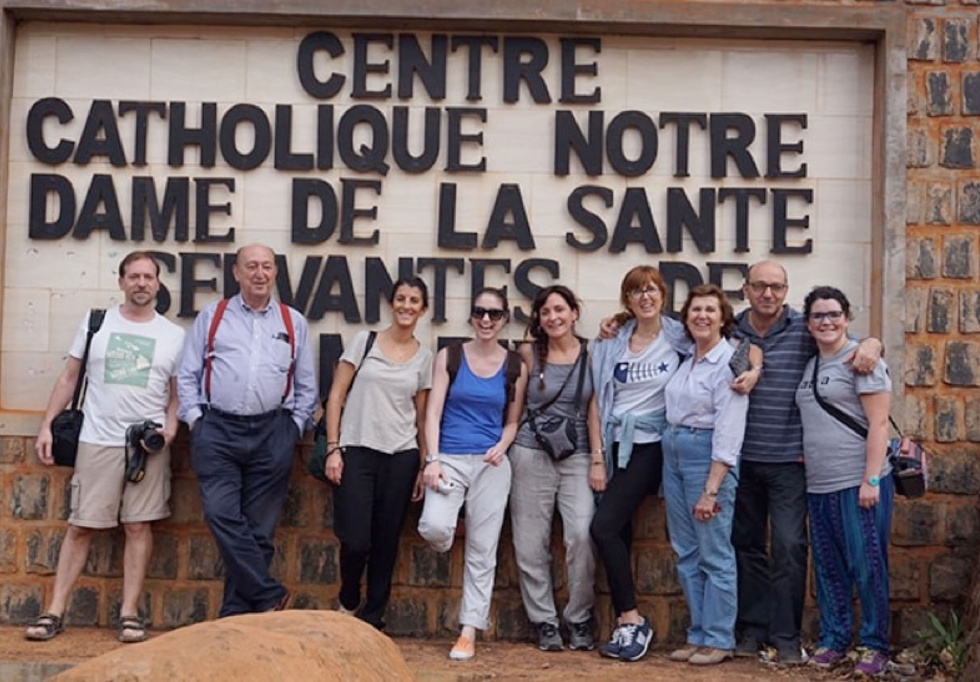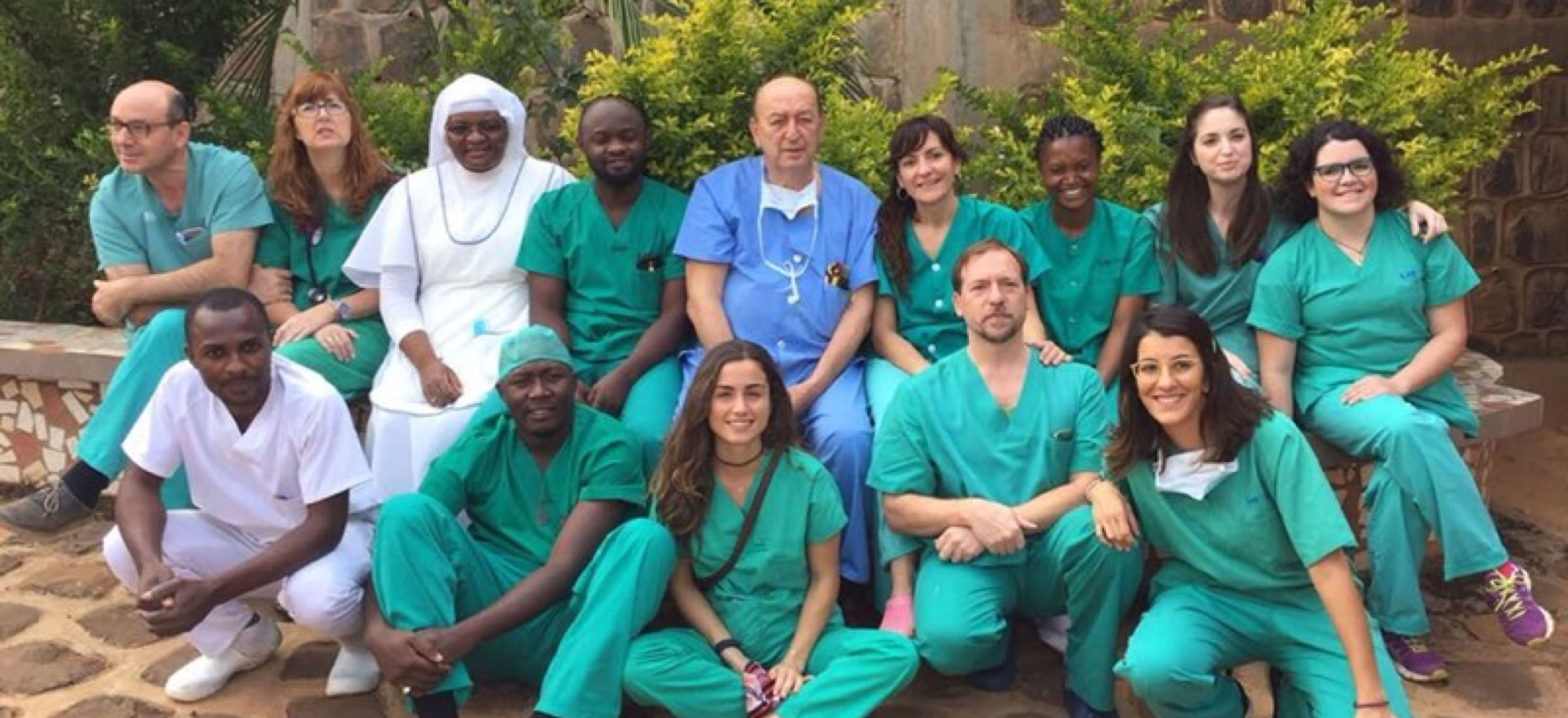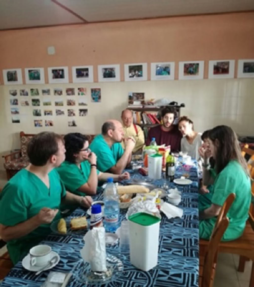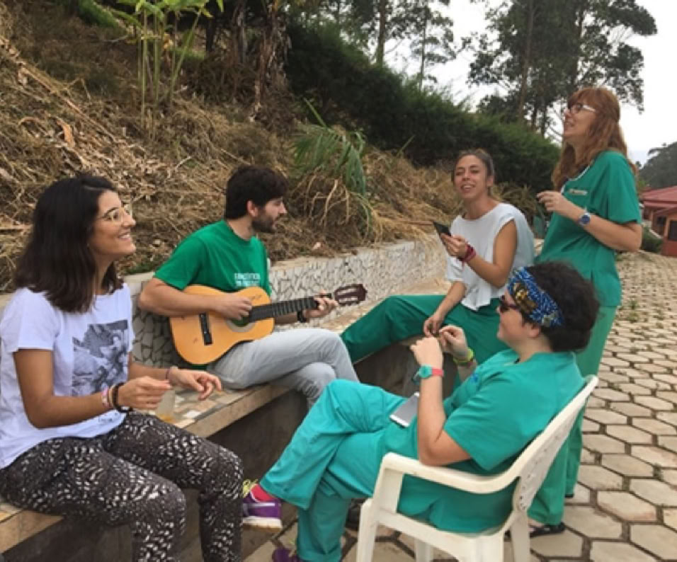 El tiempo nos ha acompañado y nos ha permitido hacer un receso en el exterior de la residencia de voluntarios antes de comer, donde el farmacéutico Luis Botella practica la guitarra rodeado de mujeres.