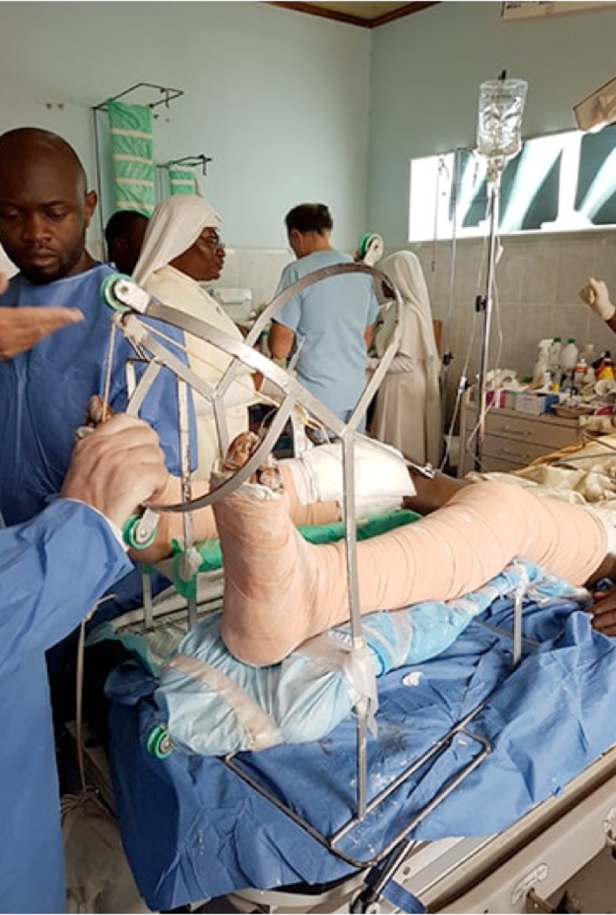 La situación era dramática con muchas lesiones simultáneas de diversas extremidades y alguno con muy mal estado general como el paciente de la imagen que padecía fractura de ambas tibias, fractura de fémur con traumatismo cráneo-encefalico severo y con hipotensión.