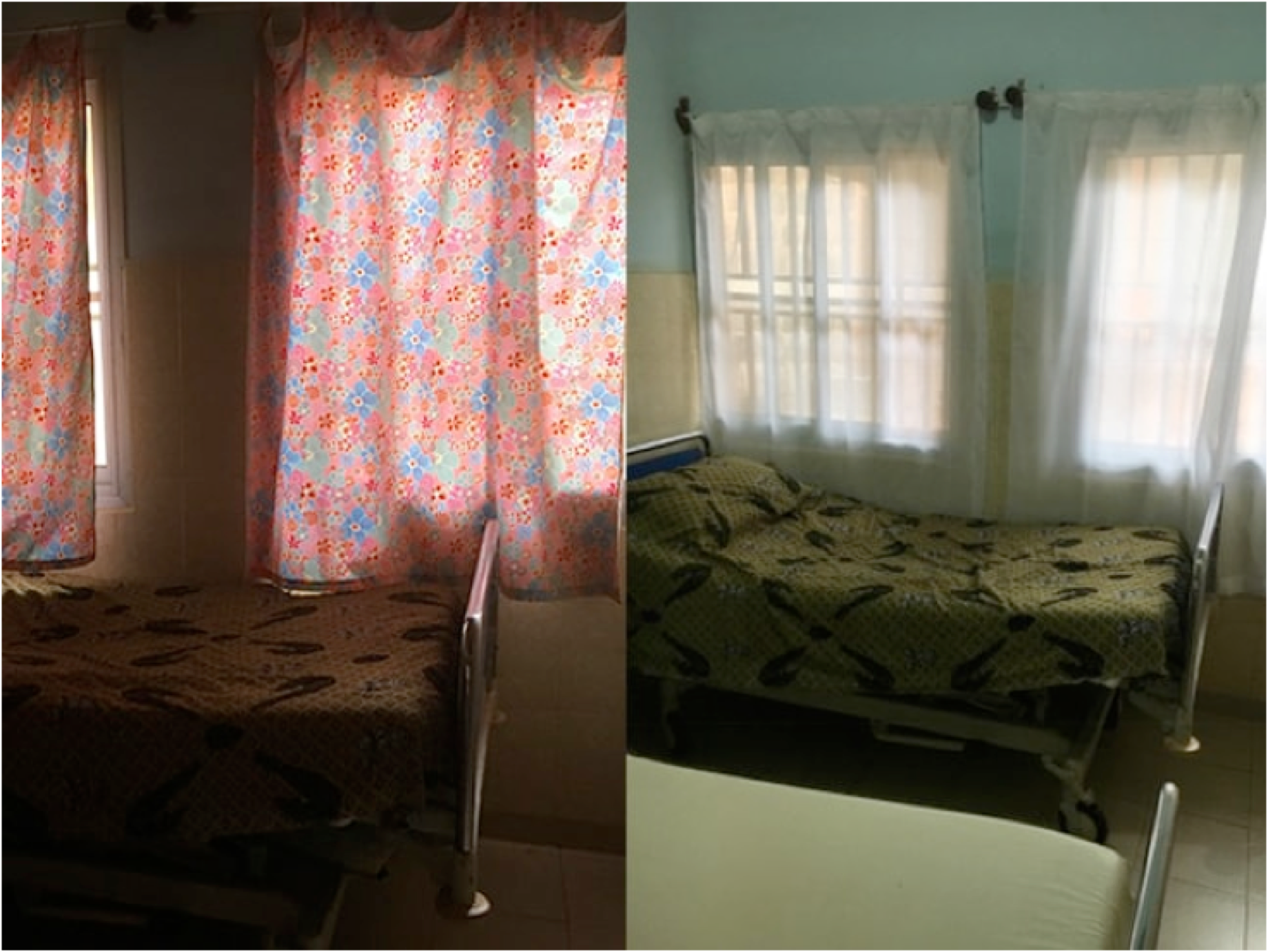 Finalmente hemos sido autorizados a cambiar las cortinas de las salas de hospitalización por unas blancas que se han confeccionado en Madrid y la hemos aportado en esta expedición. La imagen describe el antes y el después de este cambio.