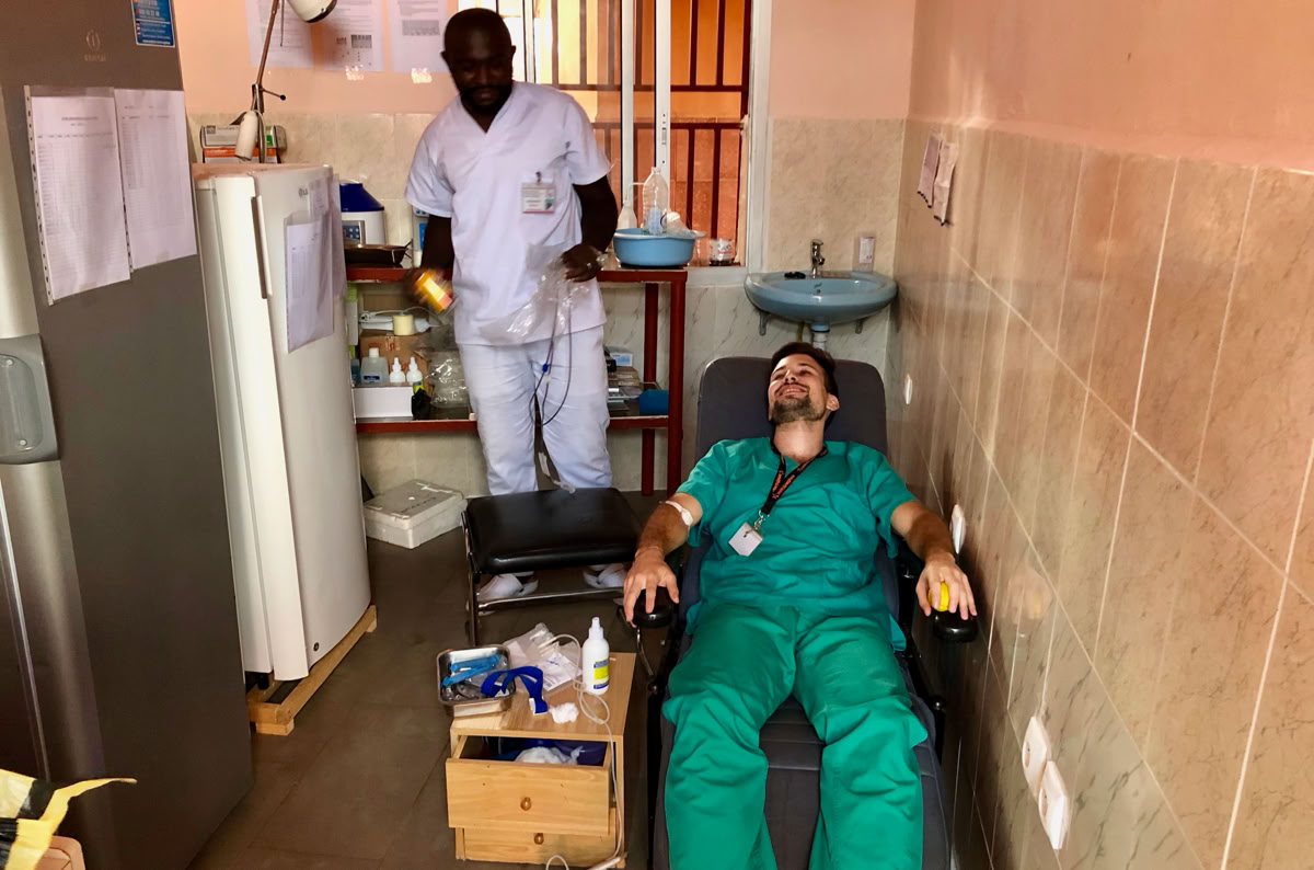 El banco de sangre sigue funcionando y en esta imagen vemos a Daniel, cooperante farmacéutico, que ha estado 6 meses en el hospital, donando sangre el día antes de volver a España.