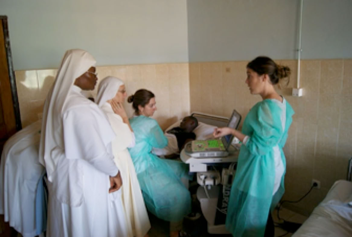 En los viajes también aprovechamos para seguir formando al equipo local. Por ejemplo, esta imagen muestra a las doctoras estuvieron enseñando a las monjas el método de localización de un nervio mediante ecografia con objeto de provocar analgesia post-operatoria.