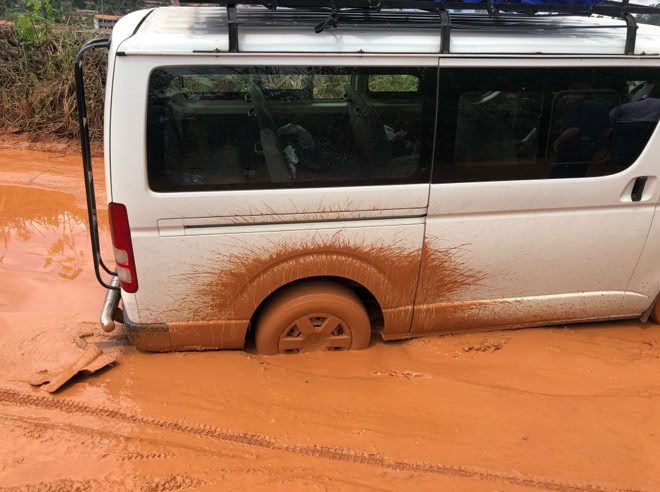 Cuando estábamos en el tramo final, en la carretera de Dschang al Hospital nos metimos en pequeño lío consecuencia de las intensas lluvias de dias anteriores, pero aunque terminamos de barro rojo hasta las rodillas, todo salió bien y pudimos llegar.