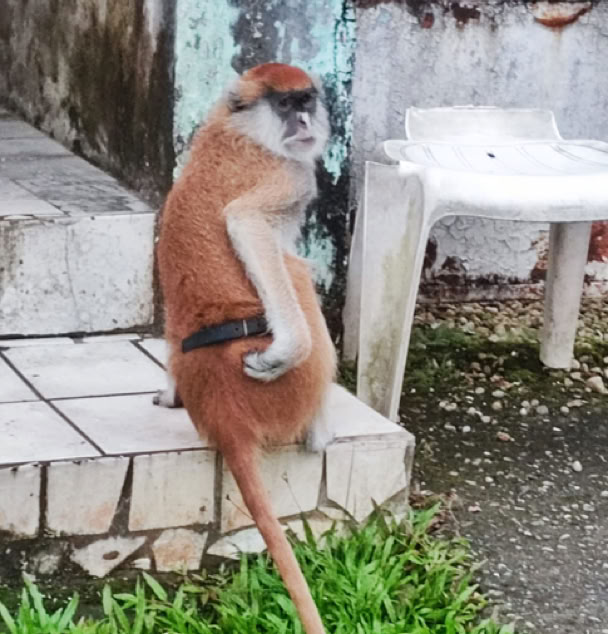 Camino de vuelta en Duala encontramos paseando por una calle del área de residentes extranjeros a este simio que nos llamó la atención .