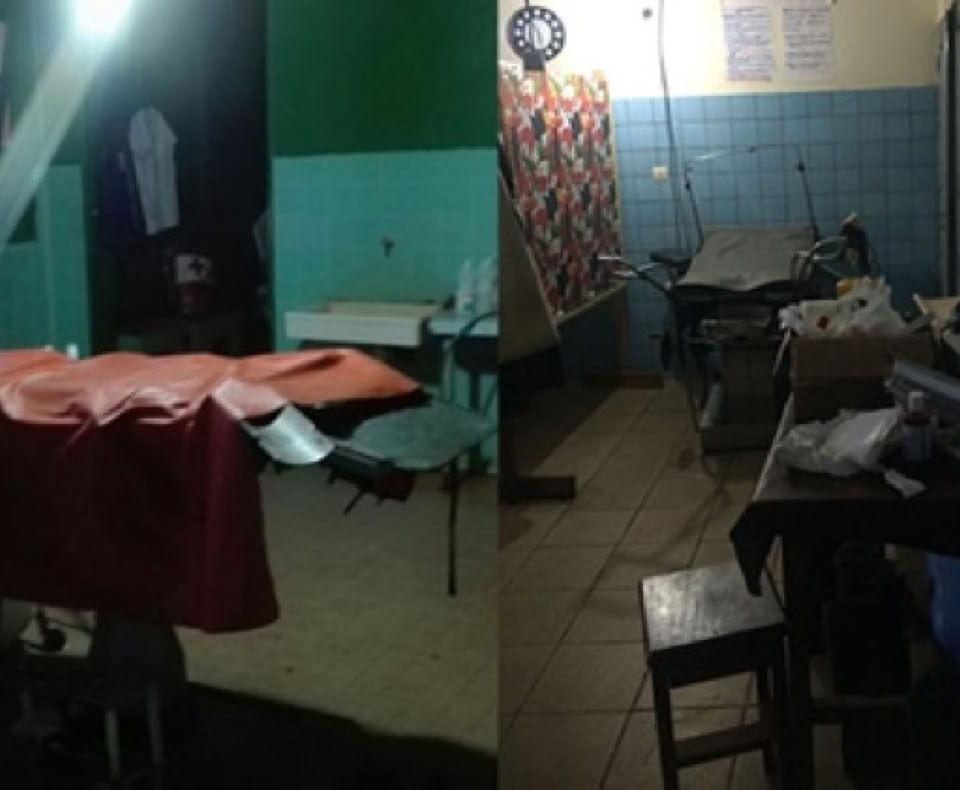 Sala de partos y quirófano del hospital estatal. No vimos aparato de anestesia. A la derecha de la imagen se observan botellas de agua para el lavado quirúrgico.