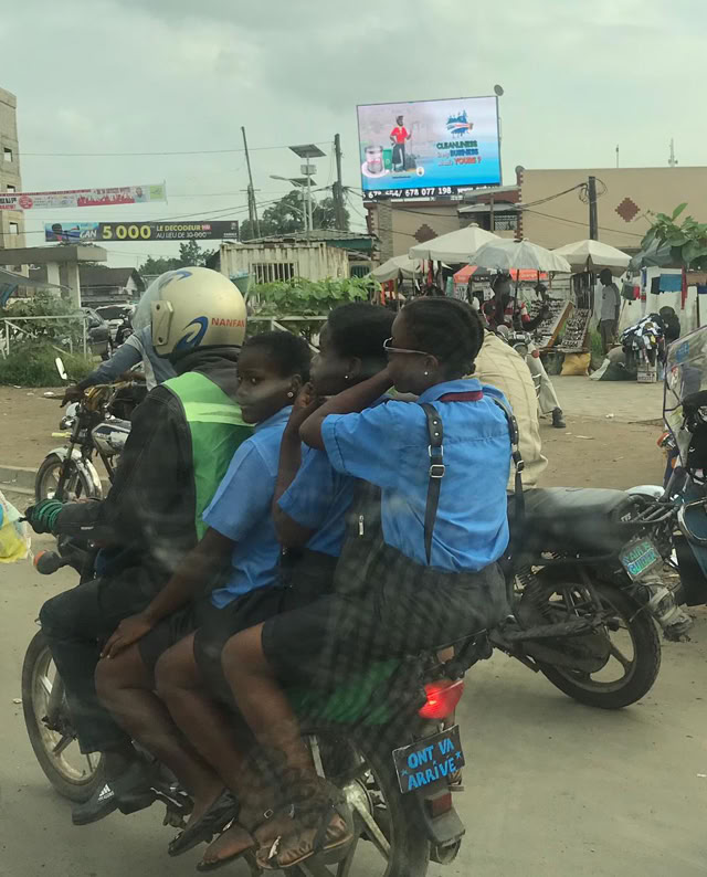 El trafico endiablado y el aprovechamiento de las motos explica la cantidad de accidentes de tráfico que recibimos en el hospital, aunque en este caso de la salida de la escuela el conductor excepcionalmente lleva casco.