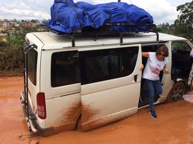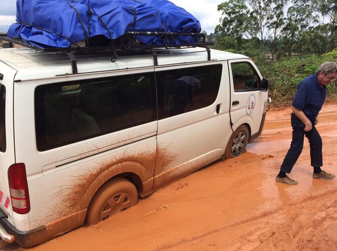 Cuando estábamos en el tramo final, en la carretera de Dschang al Hospital nos metimos en pequeño lío consecuencia de las intensas lluvias de dias anteriores, pero aunque terminamos de barro rojo hasta las rodillas, todo salió bien y pudimos llegar.