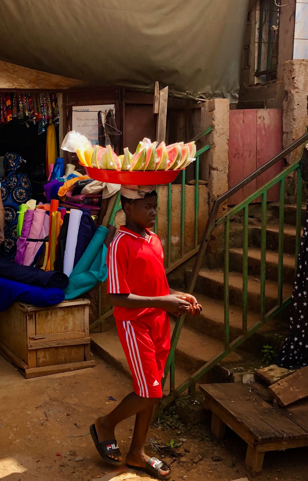 Camino de Dschang en la camioneta con Fabian de chofer que condujo como siempre por las peligrosas carreteras camerunesas. Parada obligatoria en la frutería a mitad de camino para abastecer de fruta al Hospital y estirar las piernas.