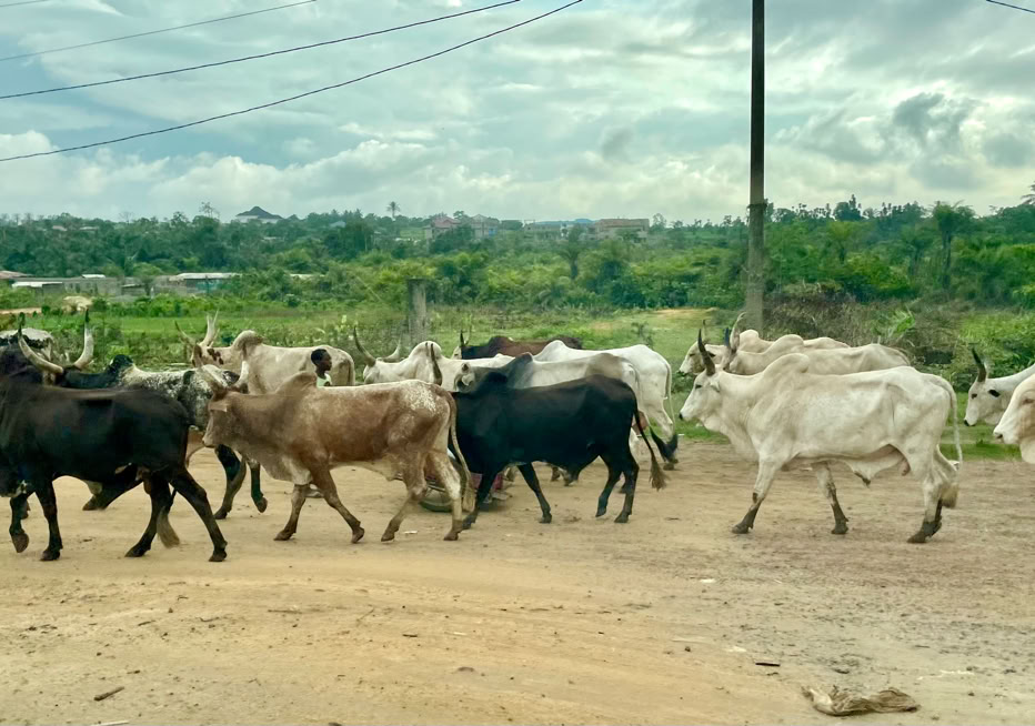 Parada en la frutería para abastecerse de piñas y otras frutas para tener postre durante toda la semana. Y como siempre nos hemos cruzado con los rebaños de cebús que abundan en la zona.