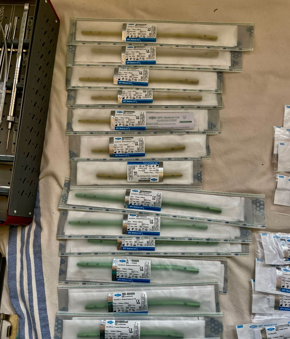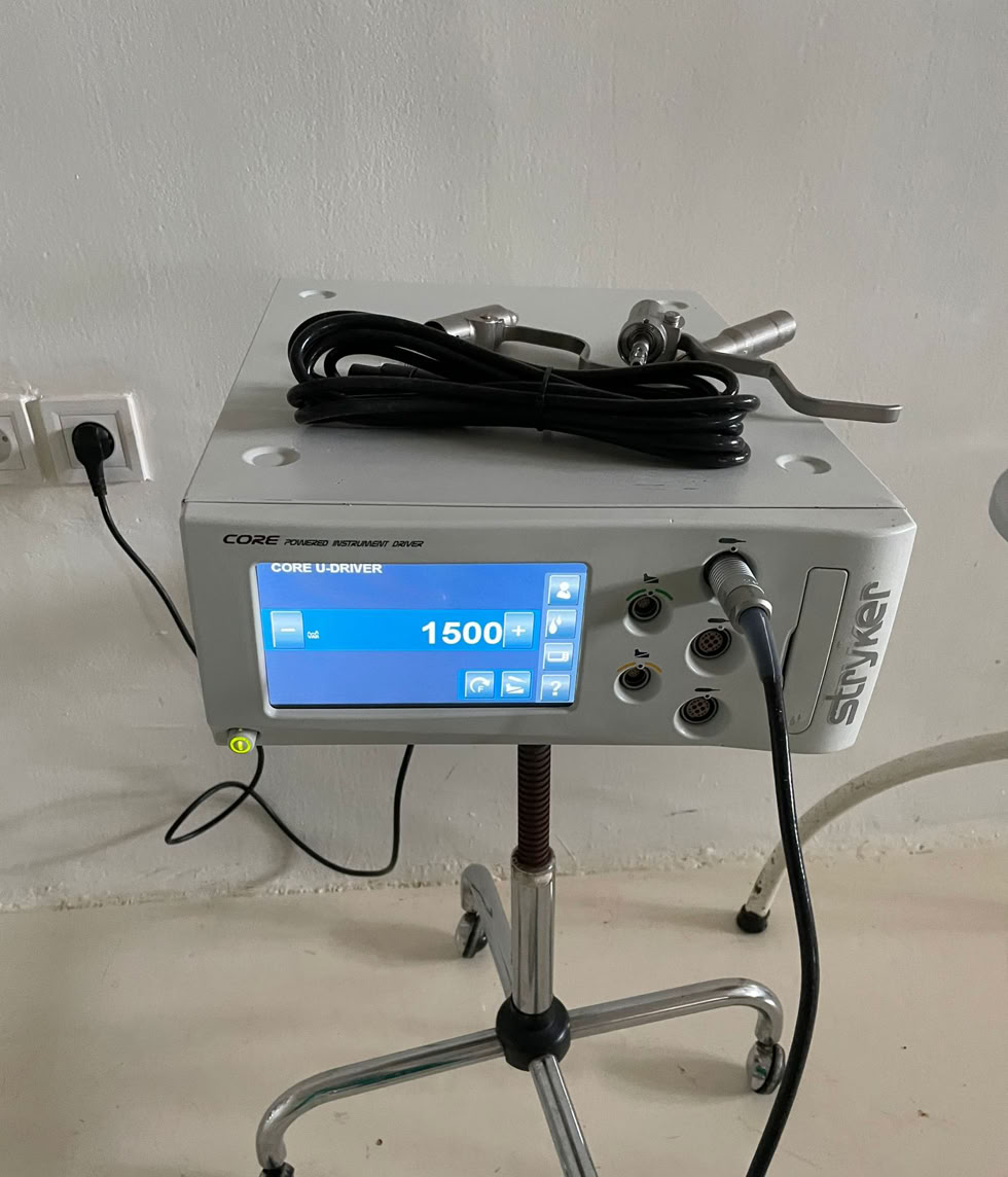 Hemos comprobado que ya tenemos los clavos para húmero con su correspondiente instrumental y que el motor que llevamos de Stryker funciona correctamente.