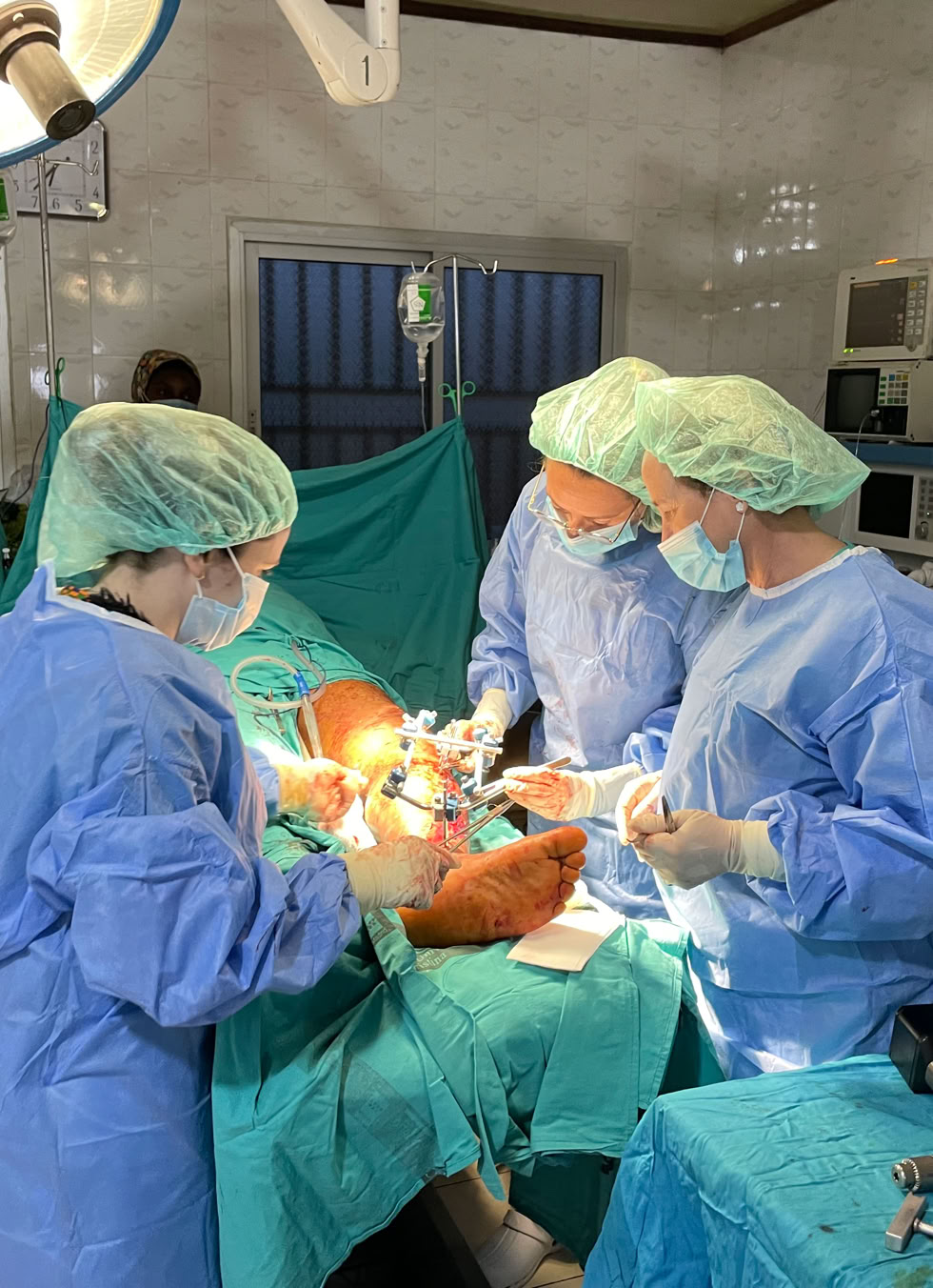 Nada mas llegar, fractura de fémur y tibia abiertas . Dos magníficas traumatólogas, una enfermera excepcional y una anestesista fuera de serie, resolvieron la urgencia.