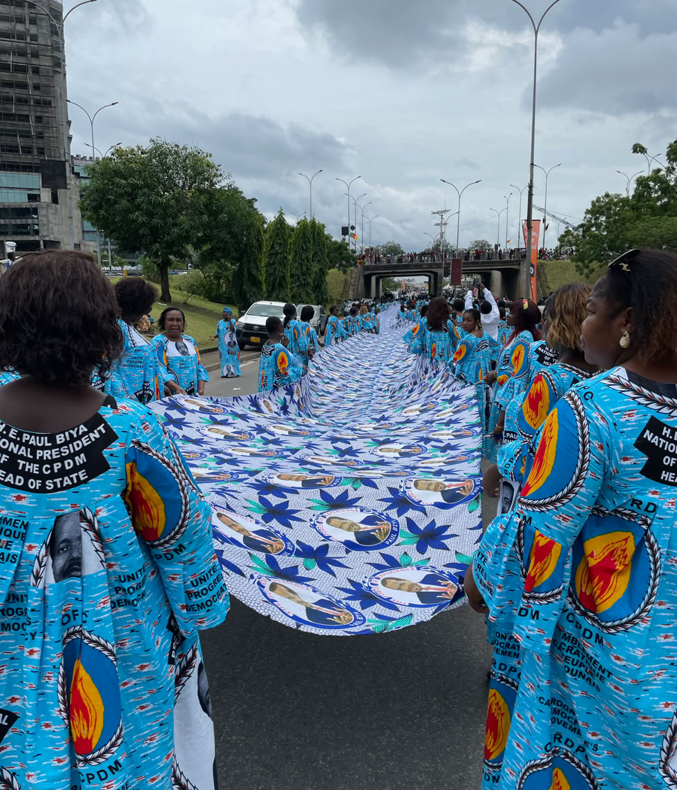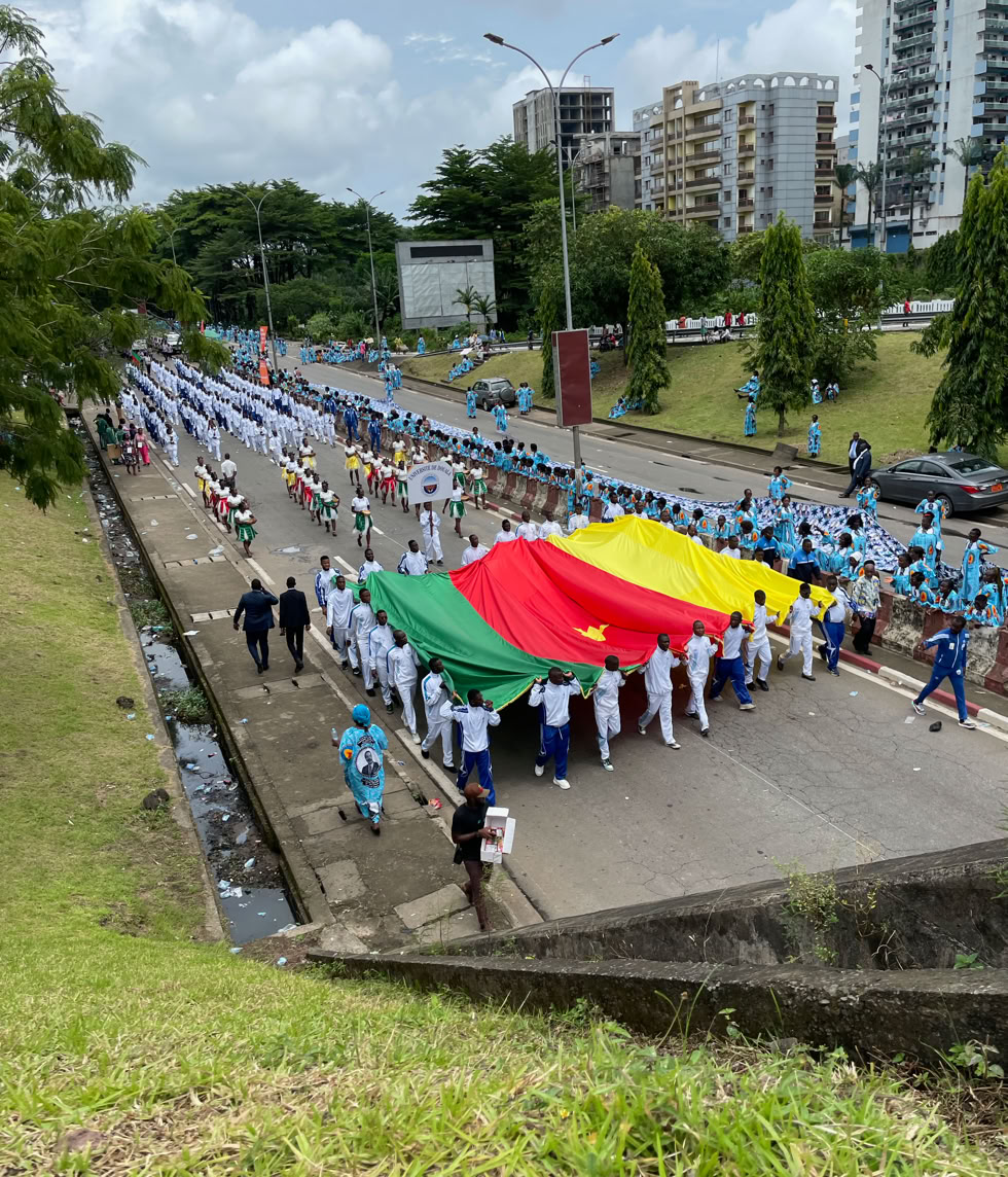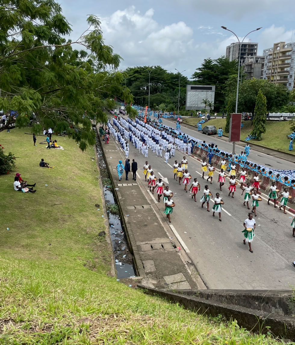 El día 20 de mayo, es el día de la Fiesta Nacional de Camerún y a pesar de que el desfile principal se hace en Yaunde con la asistencia del presidente de la República, en todas las ciudades se hacen desfiles y por supuesto en Douala también y es muy importante. Fuimos a verlo para matar el tiempo hasta la hora de ir al aeropuerto. Primero desfilan los militares y está prohibido hacer fotos pero luego desfilan representantes de la vida civil camerunesa, desde los niños de las escuelas hasta los representantes de los partidos políticos pasando por los deportistas, enfermeras, médicos, bomberos etc. En total mas de tres horas de desfile a una temperatura de 32º. Eso sí gente muy amable que al ver pasar a un grupo de blancos despistados querían hacerse fotos con nosotros, incluso me hicieron una entrevista para un. Canal de televisión