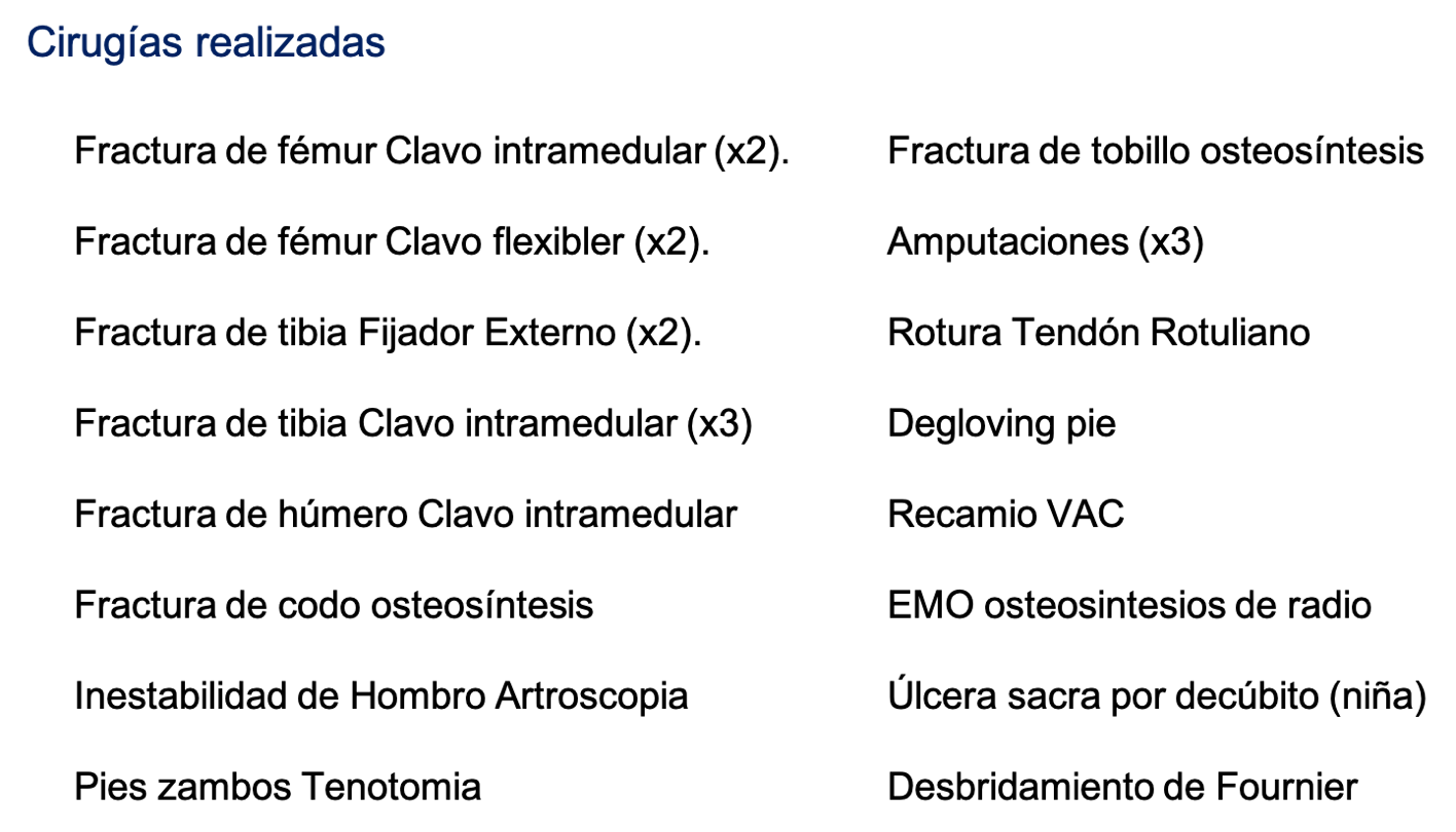Desde luego la patología que encontramos es muy distinta a la que se puede ver en un Hospital del primer mundo. Las infecciones, omnipresentes en heridas, llagas y cirugías obligan a tratamientos de desbridamientos, tratamientos de osteomielitis crónicas, amputaciones etc. como cirugías de rutina en todas las expediciones.